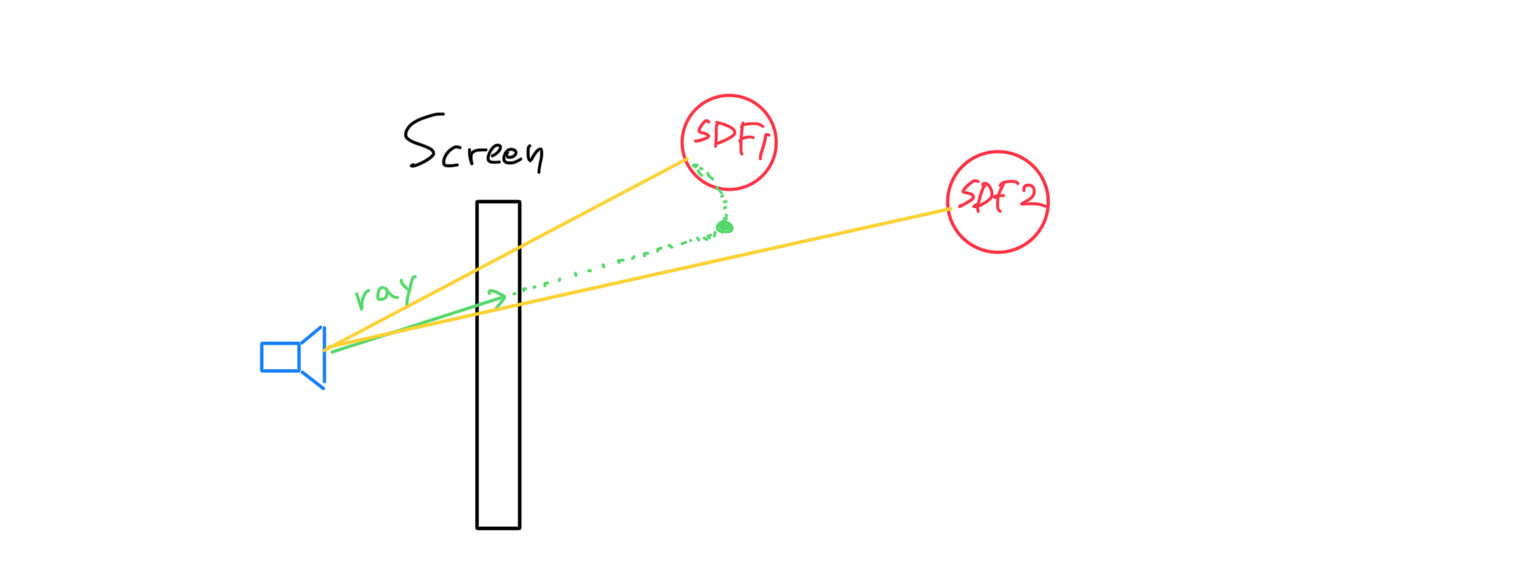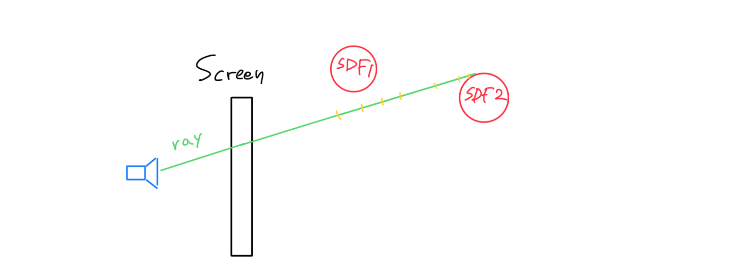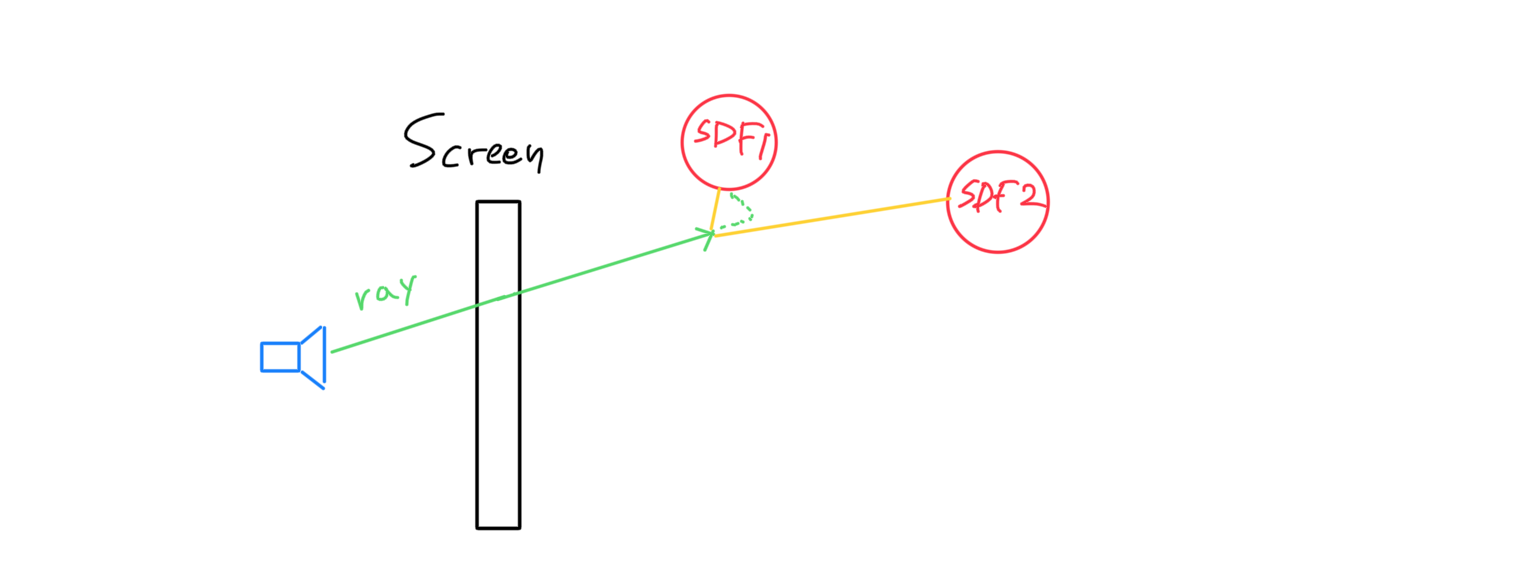 앞에서 얘기하였듯이, 앞서 구한 레이를 이제 점진적으로 진행시켜야 한다. 씬에 존재하는 물체들의 SDF 값을 비교하여 가장 작은 값(최단거리) 만큼 레이방향으로 전진시킨다.