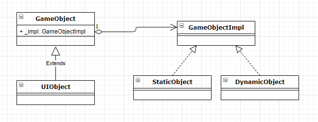 추상 기능부와 구현부를 분리하여 GameObject와 GameObjectImpl로 나누었다.