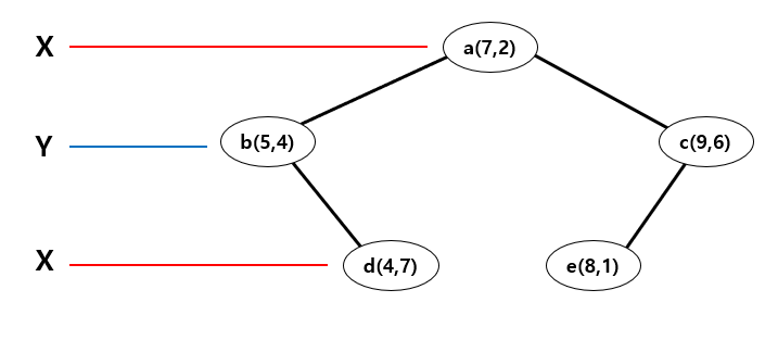 a(7,2), b(5,4), c(9,6), d(4,7), e(8,1) 이 순으로 데이터가 트리가 삽입된다 하자